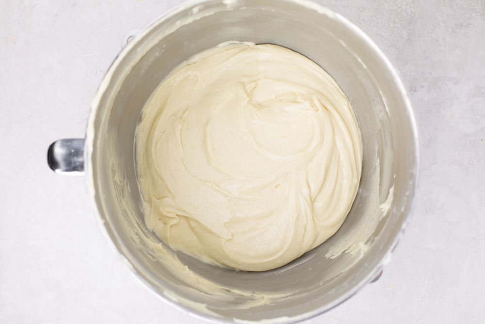 - In the bowl of a stand mixer, cream the butter and sugar until light and fluffy, about 2–3 minutes. Add the vanilla extract and the vanilla bean paste. With mixing speed on low, add the eggs one at a time, mixing until just combined.